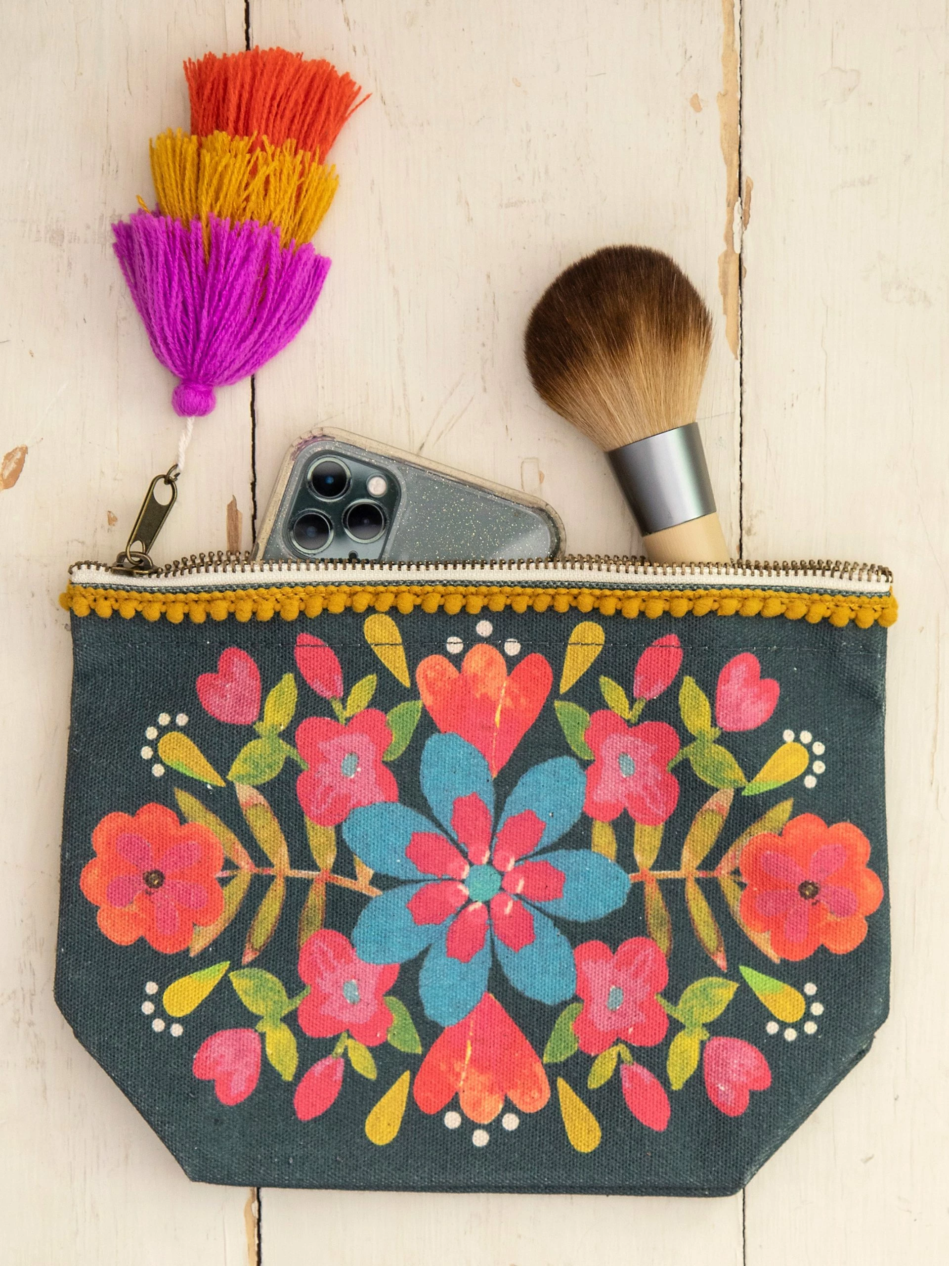 Our bright and cheery Canvas Pouch has limitless possibilities! The boho printed canvas with contrasting pom pom trim will make anyone a bit more cheerful! Pull on the stacked zipper tassel to open it up! We love things that are fun to use and carry. The message will inspire you each time you use it! This large size has a gusset for packing it full, so stuff it with your cosmetics for traveling! It also makes a perfect pencil case and is just the right size for tucking into a backpack or tote bag. Use it at home to keep your office supplies handy. We believe it’s the perfect accessory accompaniment to our Everyday Canvas Tote or any bag you have at home! Are you already thinking about collecting them all?