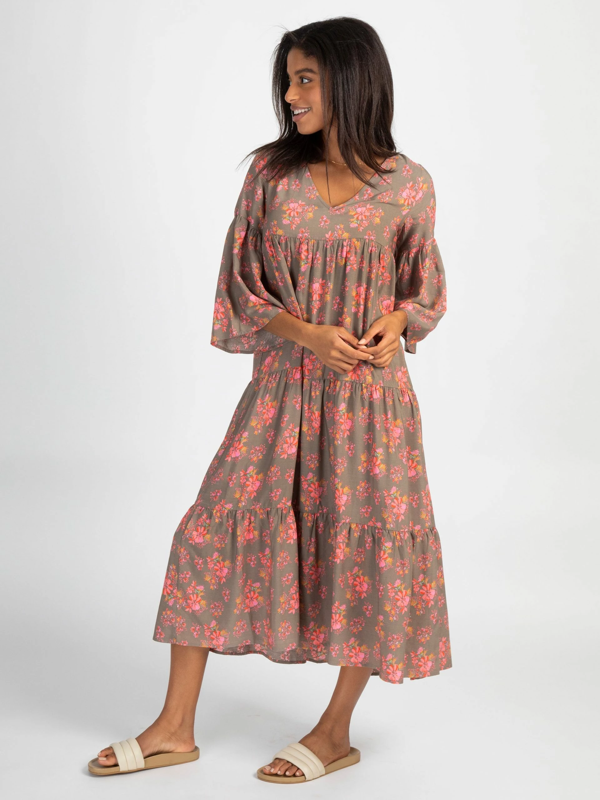 The Charlotte Midi Dress is a quick “throw on and go” dress but you’re still perfectly put together! You can dress it up or down – anything goes! This soft and lovely floral print dress has statement bell sleeves that are three-quarter length and even have a bit of ruffle for fun embellishment! The rest of this midi dress is full of flowy tiers! We love the flattering v-neckline in the front. Charlotte is comfy and beautiful – can we ask for anything more in a dress that’s always the right choice at a moment’s notice? Multiple seasons and multiple shoes pair with this dress. Whether you slip it on for work or play, it adapts to any single event of the day!