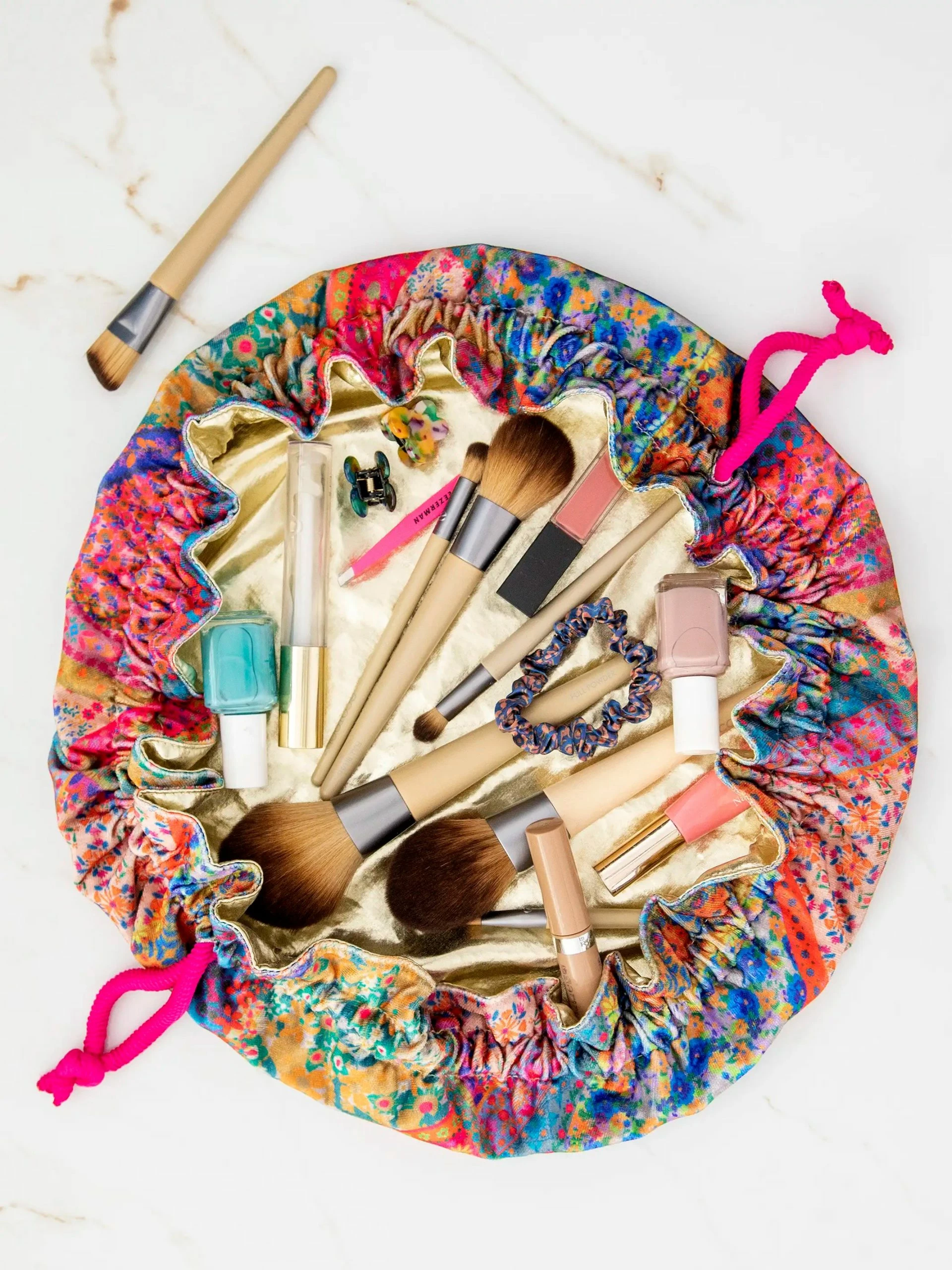 We’re obsessed with this Drawstring Velvet Cosmetic Pouch! Use it to hold your make-up or toiletries when you travel. Un-tie the pouch on the counter and it acts like a mat for your products! Once you’re finished, you can pull the strings and quickly wrap it all up… ready to go!