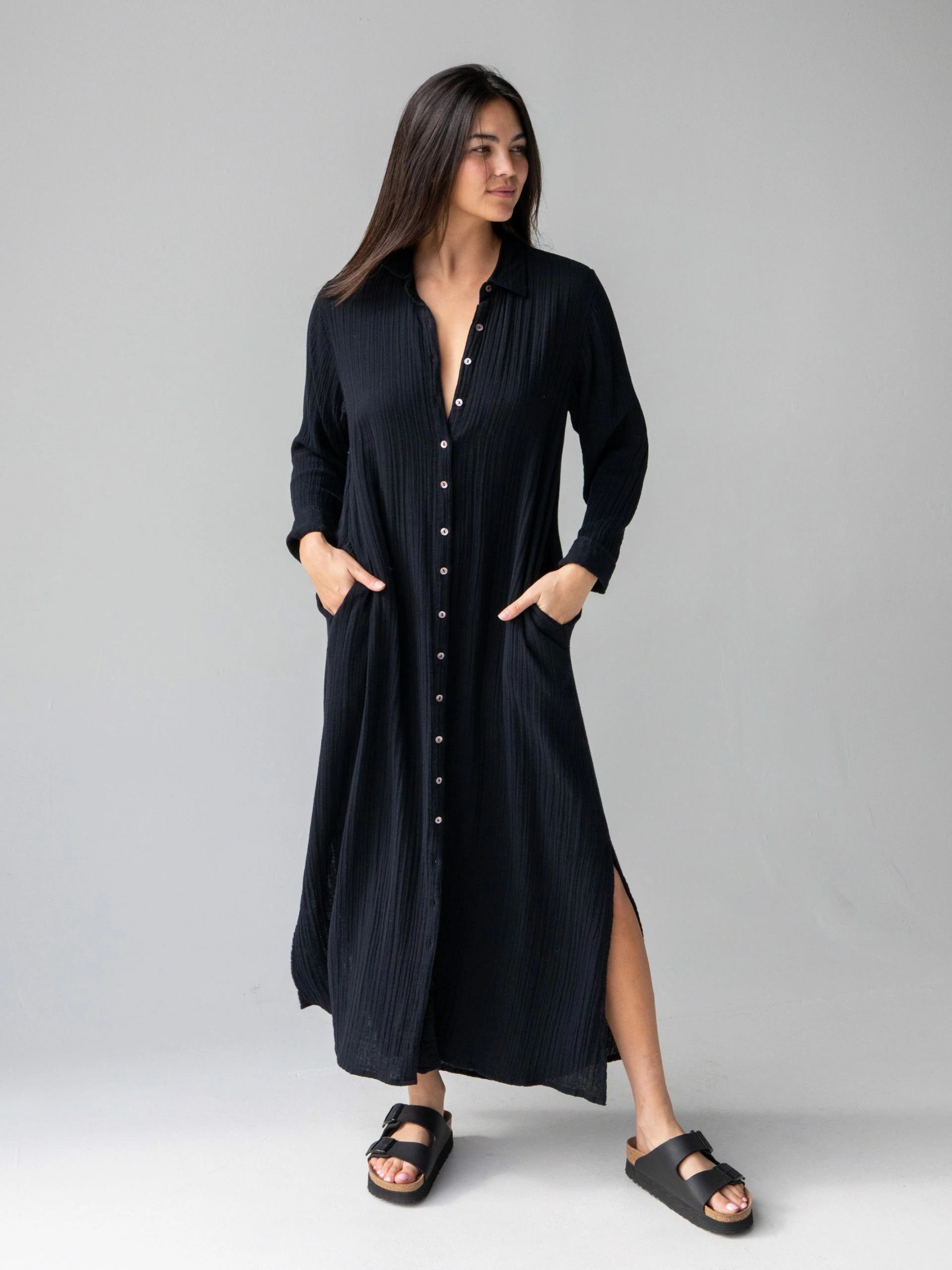 The Drew Gauze Shirtdress is SO comfy and easy to wear! It’s such a classic piece and can be easily styled with cool jewelry or a fedora! It’s made from 100% cotton gauze and features side slits, pockets and buttons all the way down… it’s literally like a basic button-down shirt, but as a dress!
