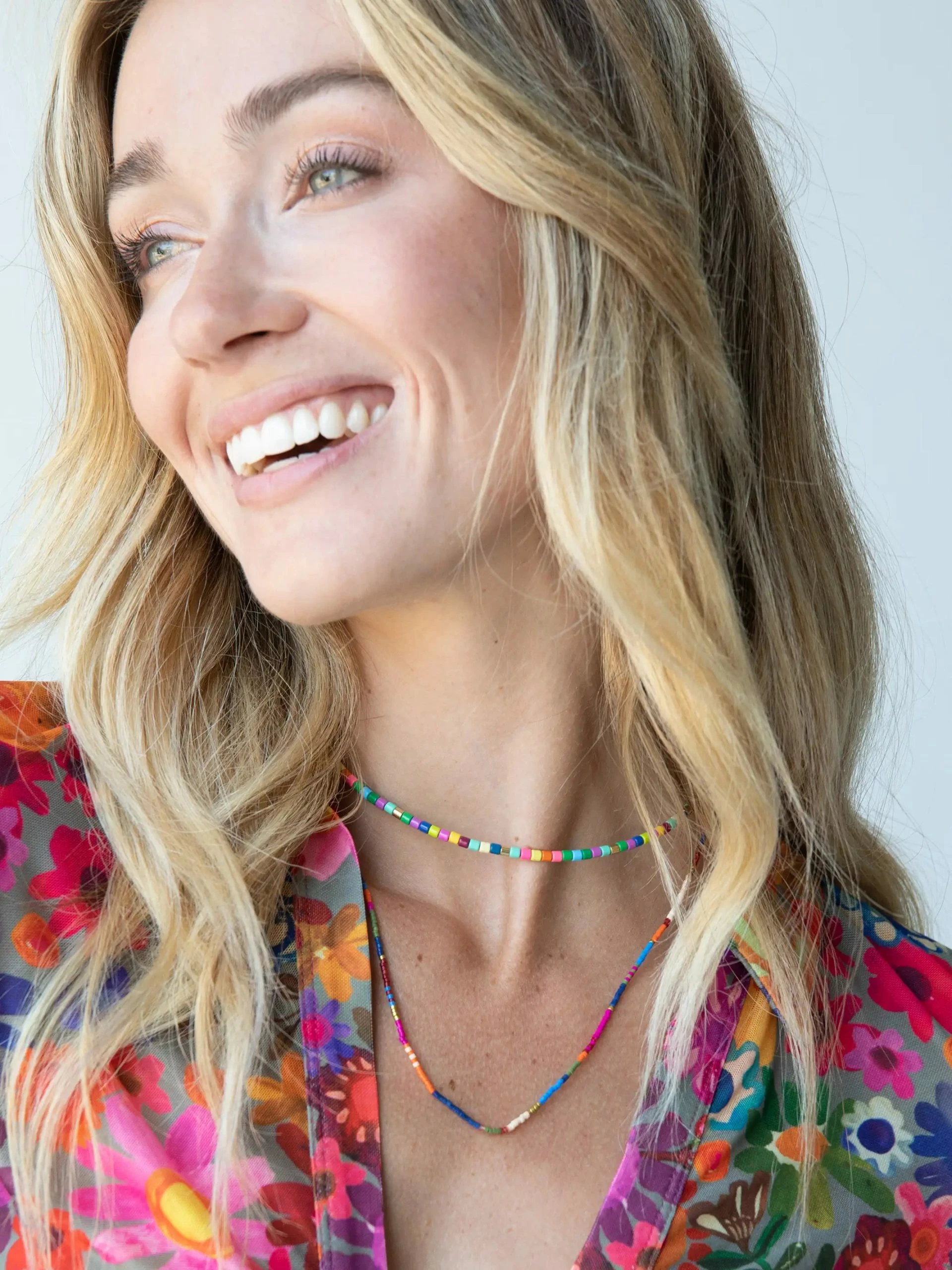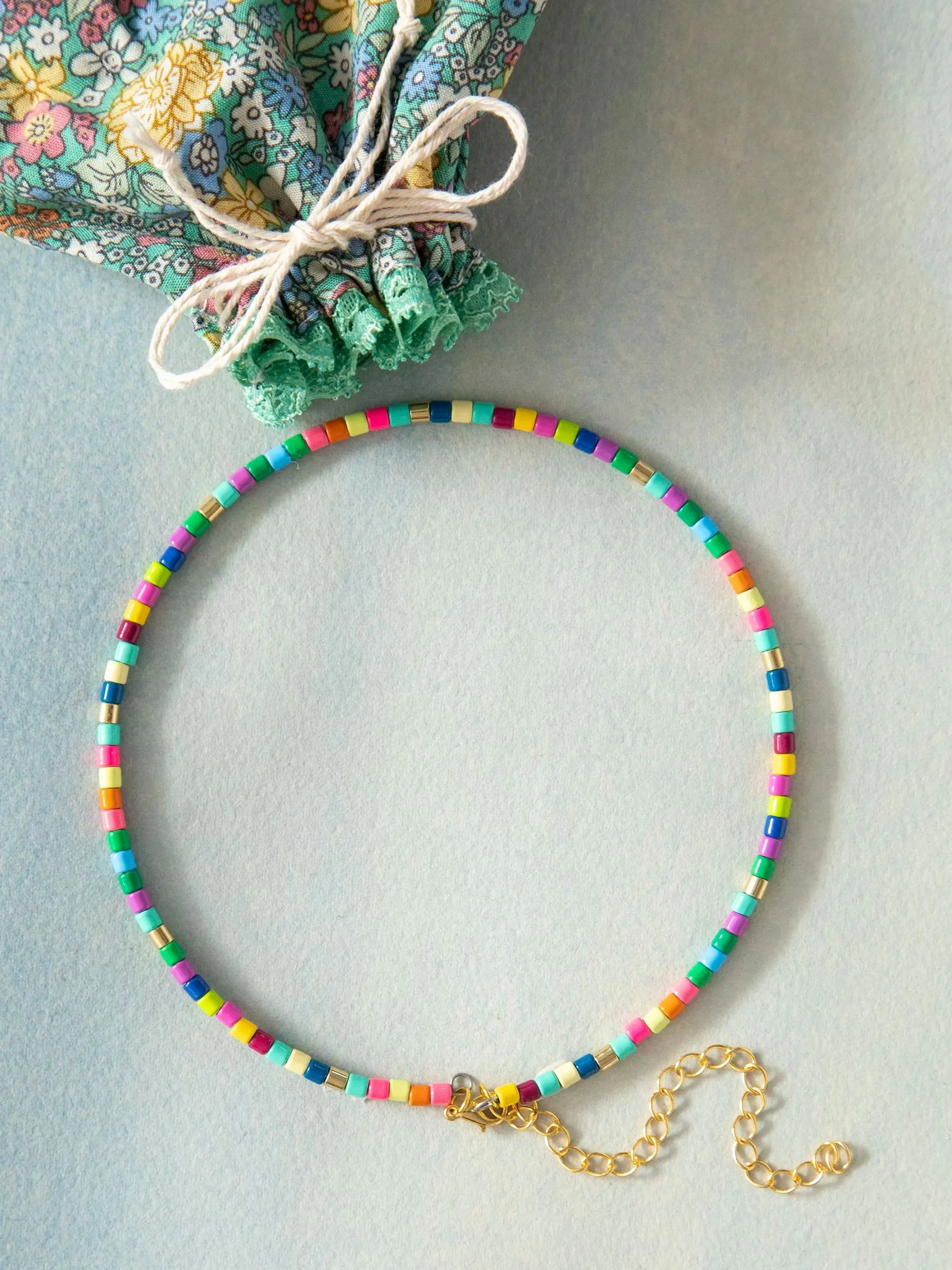 This beautiful choker is full of jewel toned enamel beads will literally go with anything in your closet! The array of colorful beads and discs will have you reaching for it daily! This cute necklace looks just right at the beach OR when you’re wearing a maxi dress! So sweetly simple– yet will brighten up any outfit! It even comes ready to give in a little remnant bag in a super cute print!