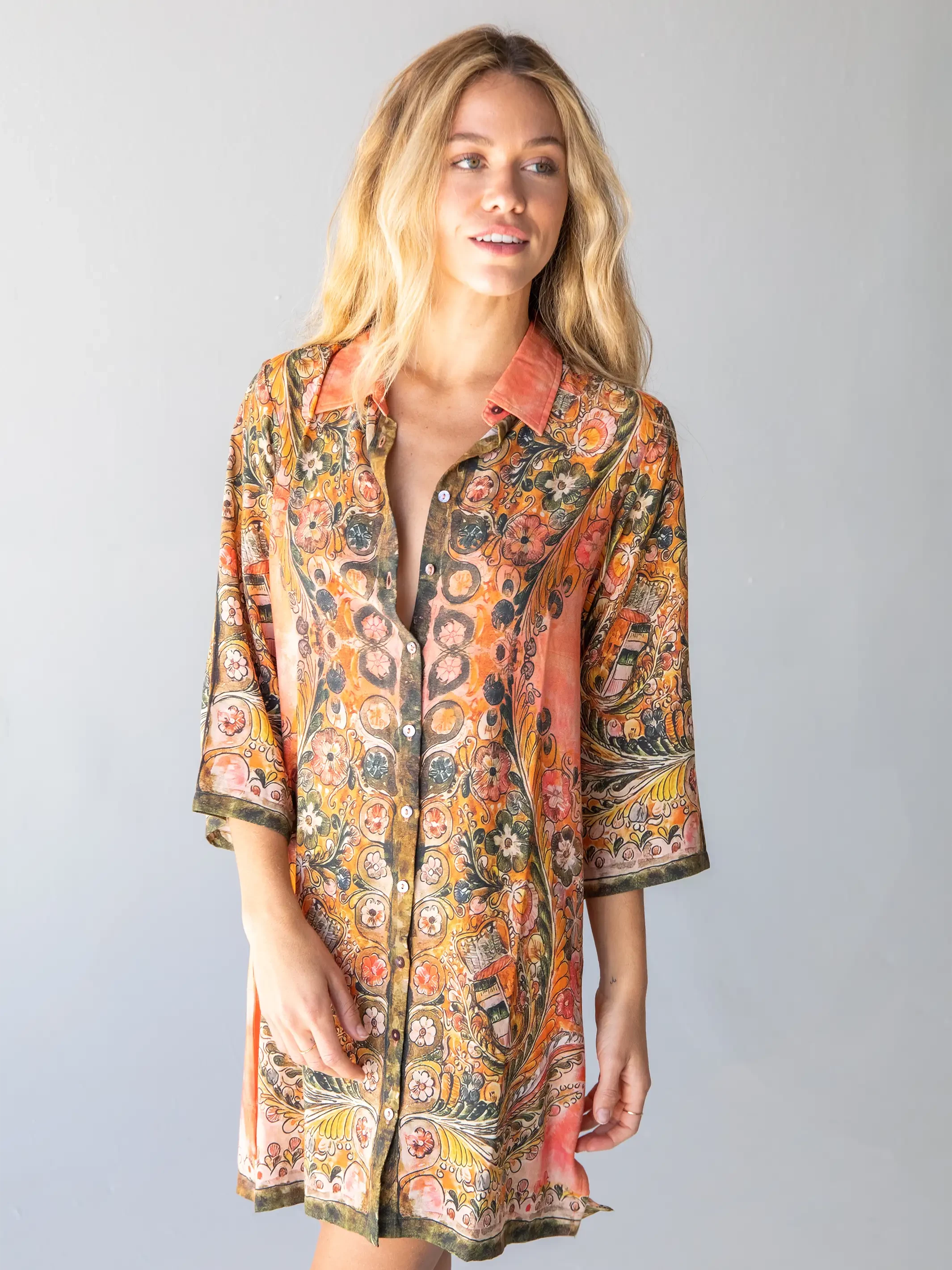 The Fiona Tunic Dress will mesmerize you with a print that’s like a watercolor painting! With a color palette as flowy as the fabric, the vintage-like design will make you swoon when you see it in person. Tons of options happen with buttons up the front! Is it a dressy dress with heels or a jacket with a tank and jeans? Or throw on your Birks and call it a day!