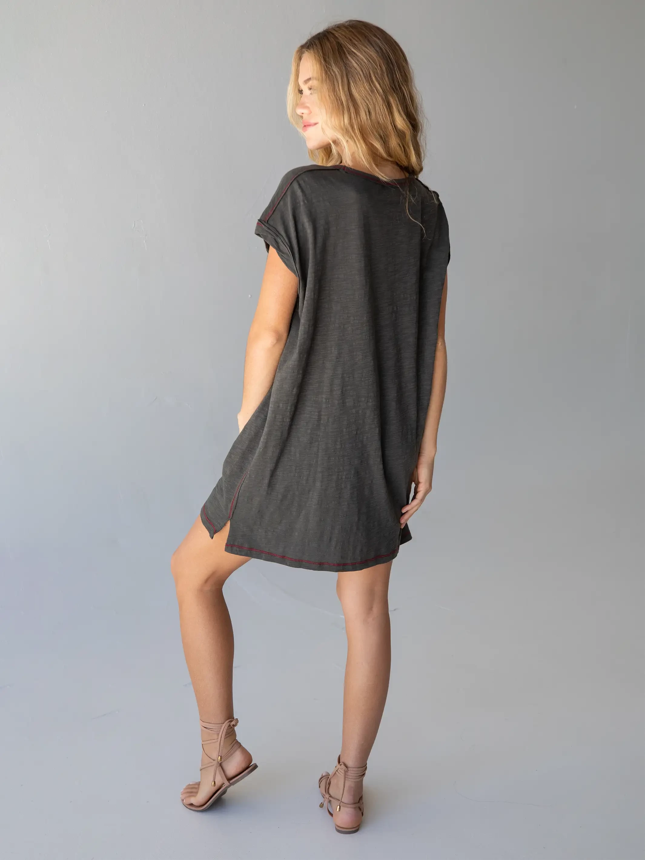 When you love a tee as much as we love our Frankie Tee, we had to design a t-shirt dress just like it! We took the same 100% cotton slub fabric and extended it to midi length. It has side slits for ease of slouching on the couch or running to the store. Raw edge seams, dropped shoulders, and intentional twisted cuffs give it a fun and cool look. However, you’ll simply adore wearing it because it’s like slipping on your favorite, comfy, old t-shirt. That’s not to say that you can’t dress up Frankie! Throw on this dress with a jacket and boots and you’ll feel just as relaxed as you do in a tee but with elevated style! This comfy closet staple has a supremely comfortable and oversized silhouette, so size down for a slimmer fit. If you love the Frankie, check out the long version and the tee as well!
