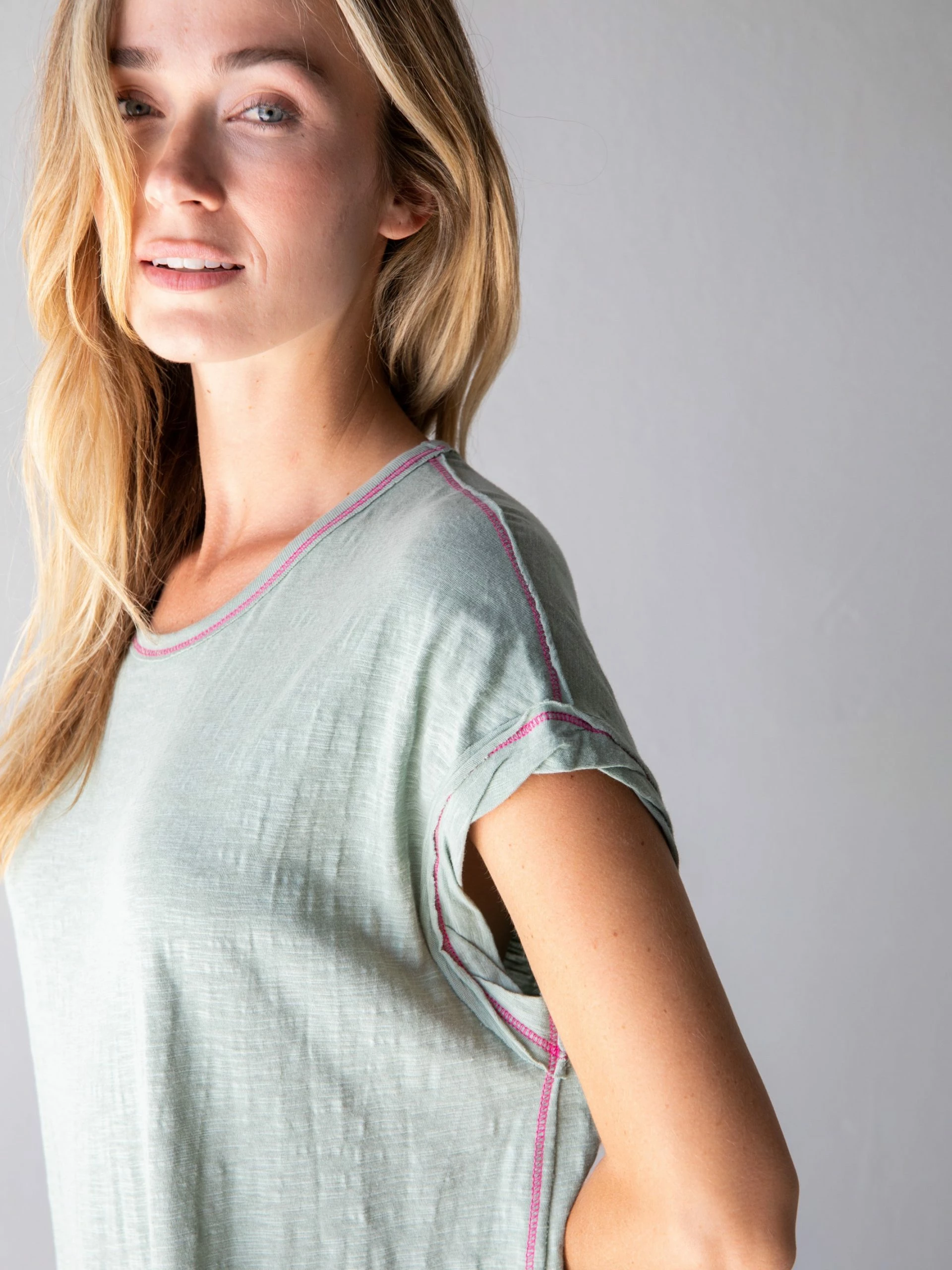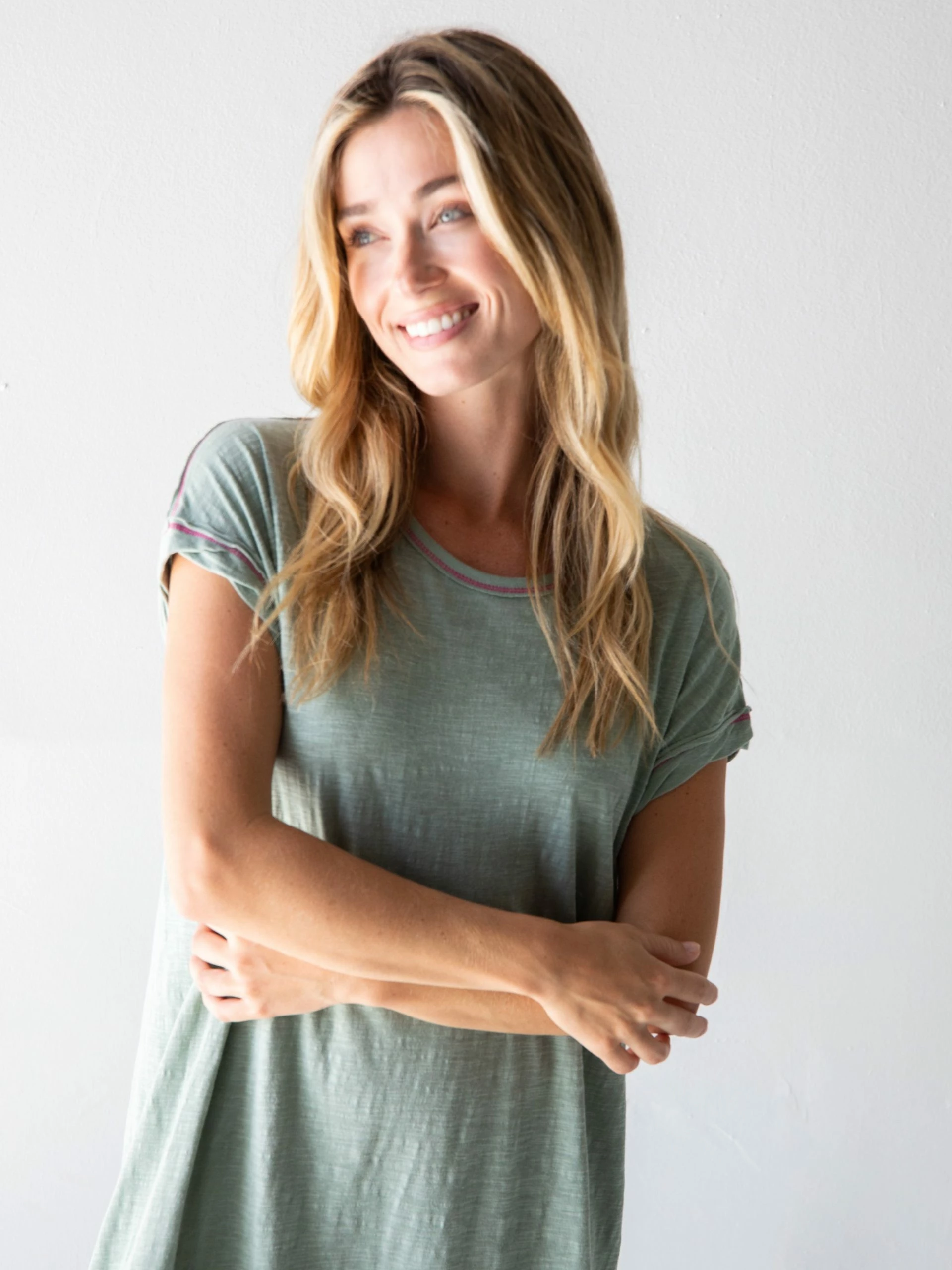 When you love a tee as much as we love our Frankie Tee, we had to design a t-shirt dress just like it! We took the same 100% cotton slub fabric and extended it to midi length. It has side slits for ease of slouching on the couch or running to the store. Raw edge seams, dropped shoulders, and intentional twisted cuffs give it a fun and cool look. However, you’ll simply adore wearing it because it’s like slipping on your favorite, comfy, old t-shirt. That’s not to say that you can’t dress up Frankie! Throw on this dress with a jacket and boots and you’ll feel just as relaxed as you do in a tee but with elevated style! This comfy closet staple has a supremely comfortable and oversized silhouette, so size down for a slimmer fit. If you love the Frankie, check out the long version and the tee as well!