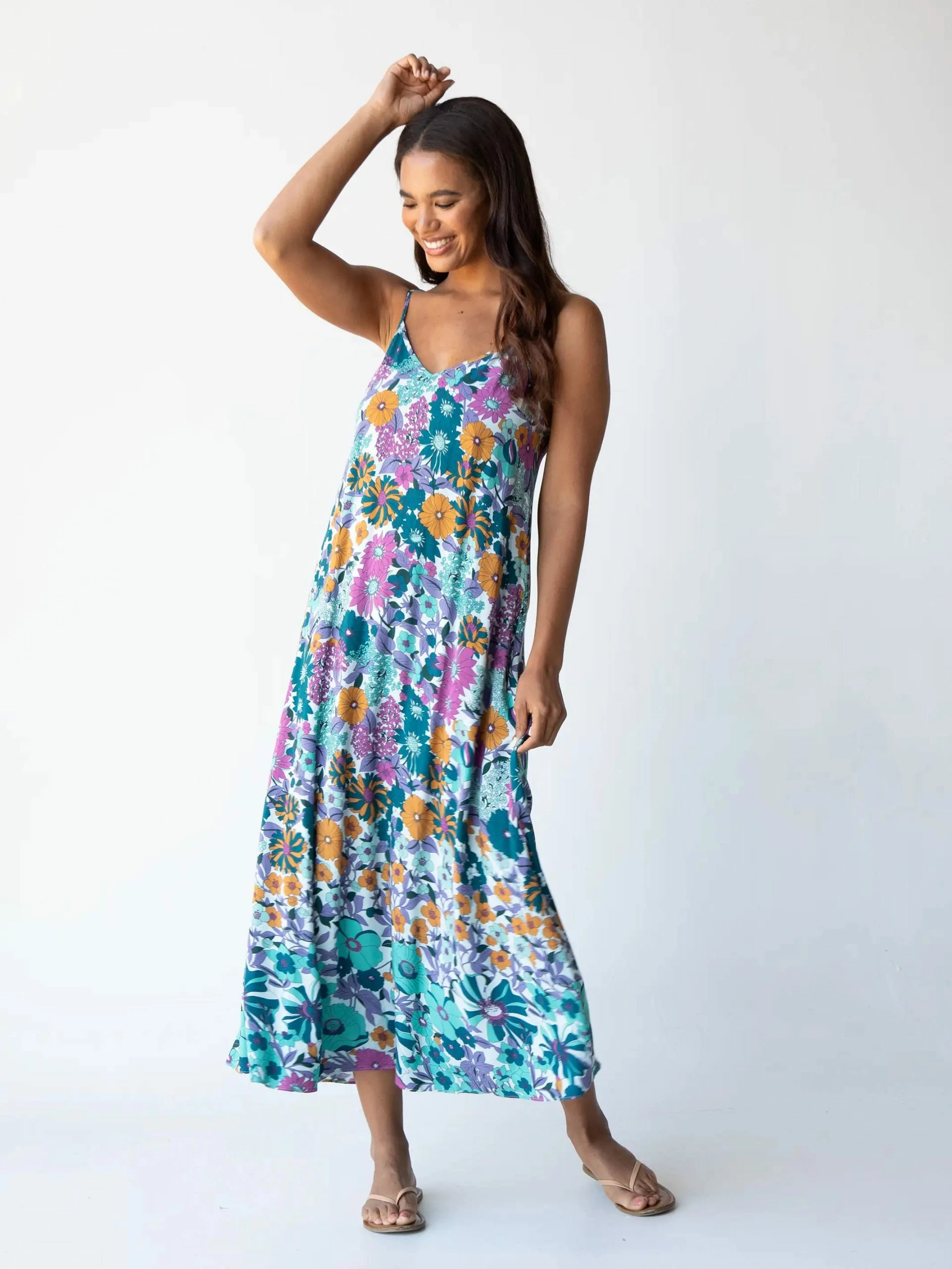 The Gracie Slip Dress is a dress that you can literally slip on and go! From its adjustable spaghetti straps and v-neck to the bottom of the flared maxi hem, it’s an easy choice for wearing anywhere! It has a smooth a-line style and relaxed fit that will keep you looking beautiful and feeling feminine, yet super comfy. Go shopping or dress it up for a fun event! While it’s flawless as a cheery sundress, you can brighten up cooler months by wearing it with boots and a sweater! A button-up tied in the front is a casual and fun change-up and adds a whole new look for this charmer! We love Gracie’s versatility, and you will too! You might need more than one floral print…
