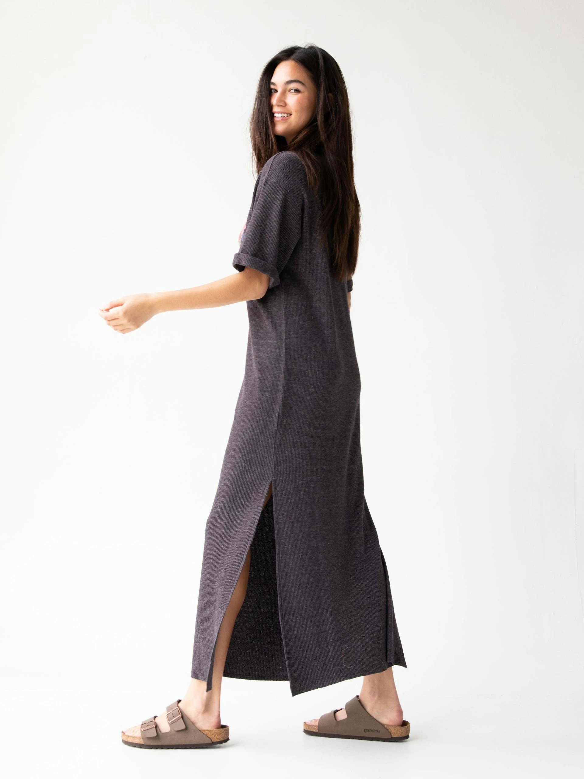 Say hello to the t-shirt dress you cannot be without! Our Graphic Tee Maxi Dress is like wearing a maxi length version of the softest waffle weave knit tee that you’ve ever felt. Yes, please! Super soft thermal material… casual and cozy! The cuffed fitted sleeves flatter and the high slit makes it fun and flirty. It’s a keeper for year-round. Wear sneakers, sandals, or Birks, or add boots and a jacket in the cool months. Wear it on a date or wear it to watch your kid play baseball. We guarantee you’ll reach for it again and again because it keeps you comfy and supremely cute. You will be so happy you have this wardrobe staple! Should we make one with another design? Let us know!