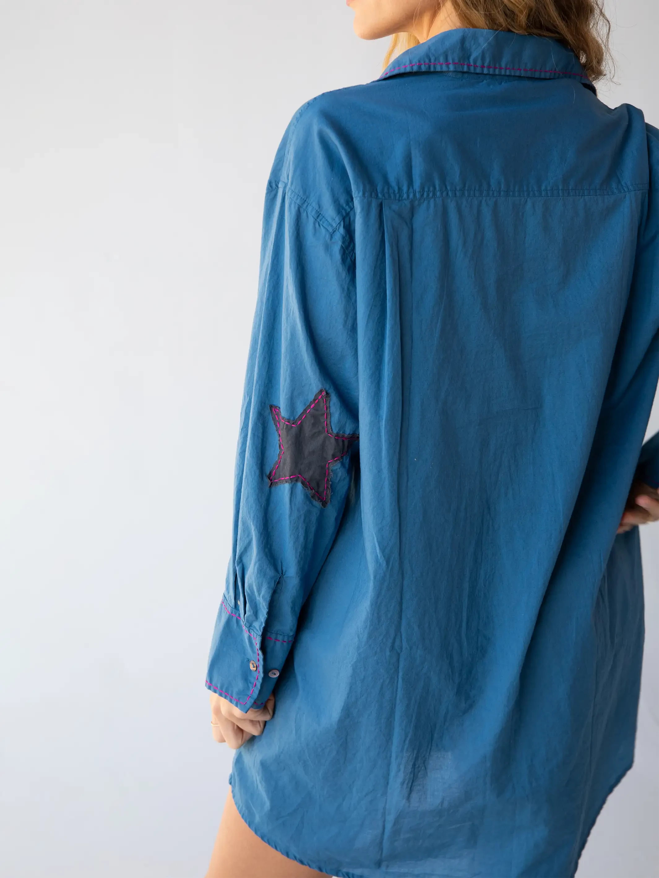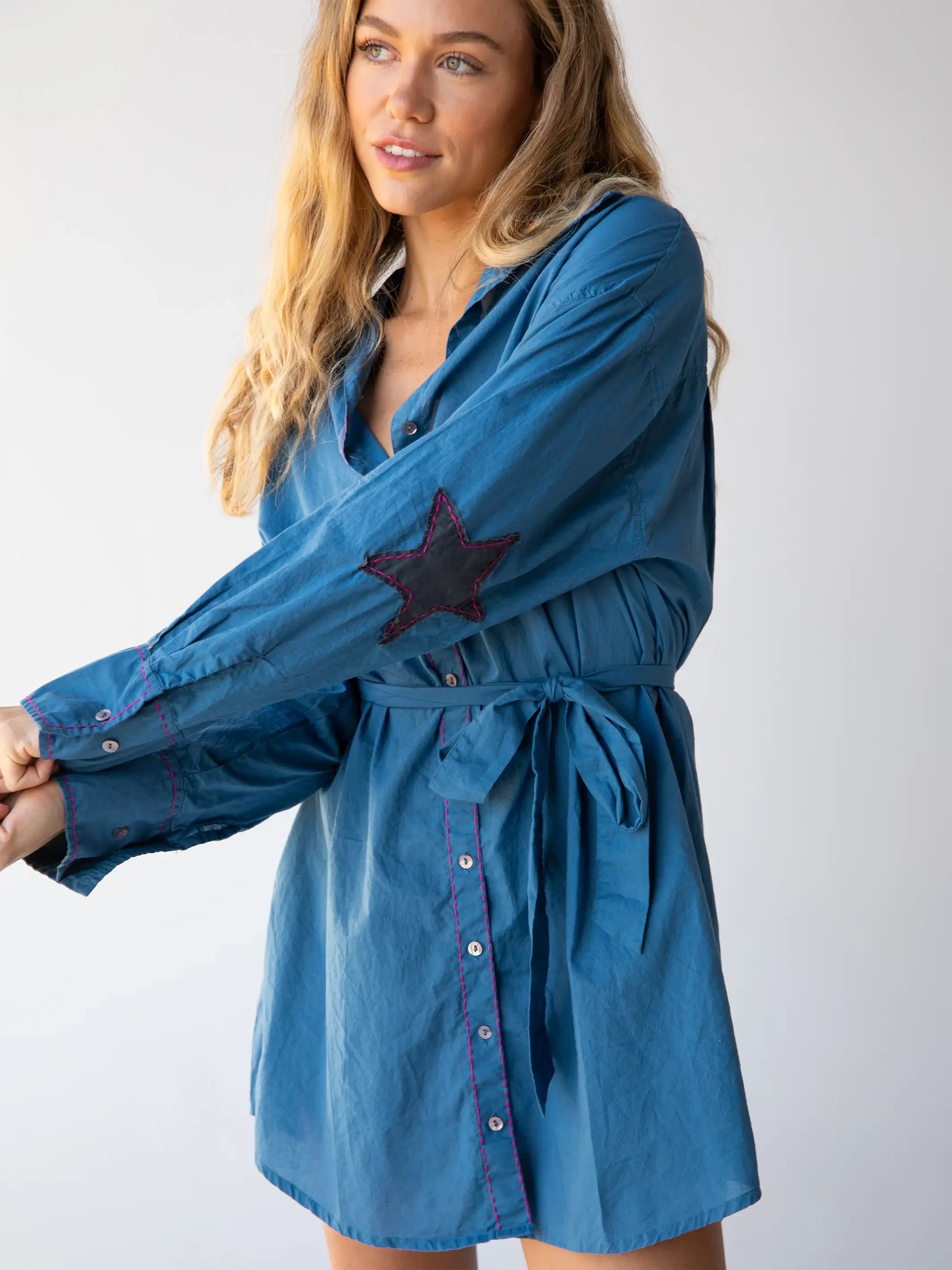 Update your wardrobe in a fun casual way with this cute shirtdress! The whipstitched trim, wide cuffs, and whimsical star patches will make you smile, and super soft cotton will keep you comfy. Define your waist with the included belt or wear it without! Wear it as a mini dress or slip it on with jeans like a tunic top or jacket!