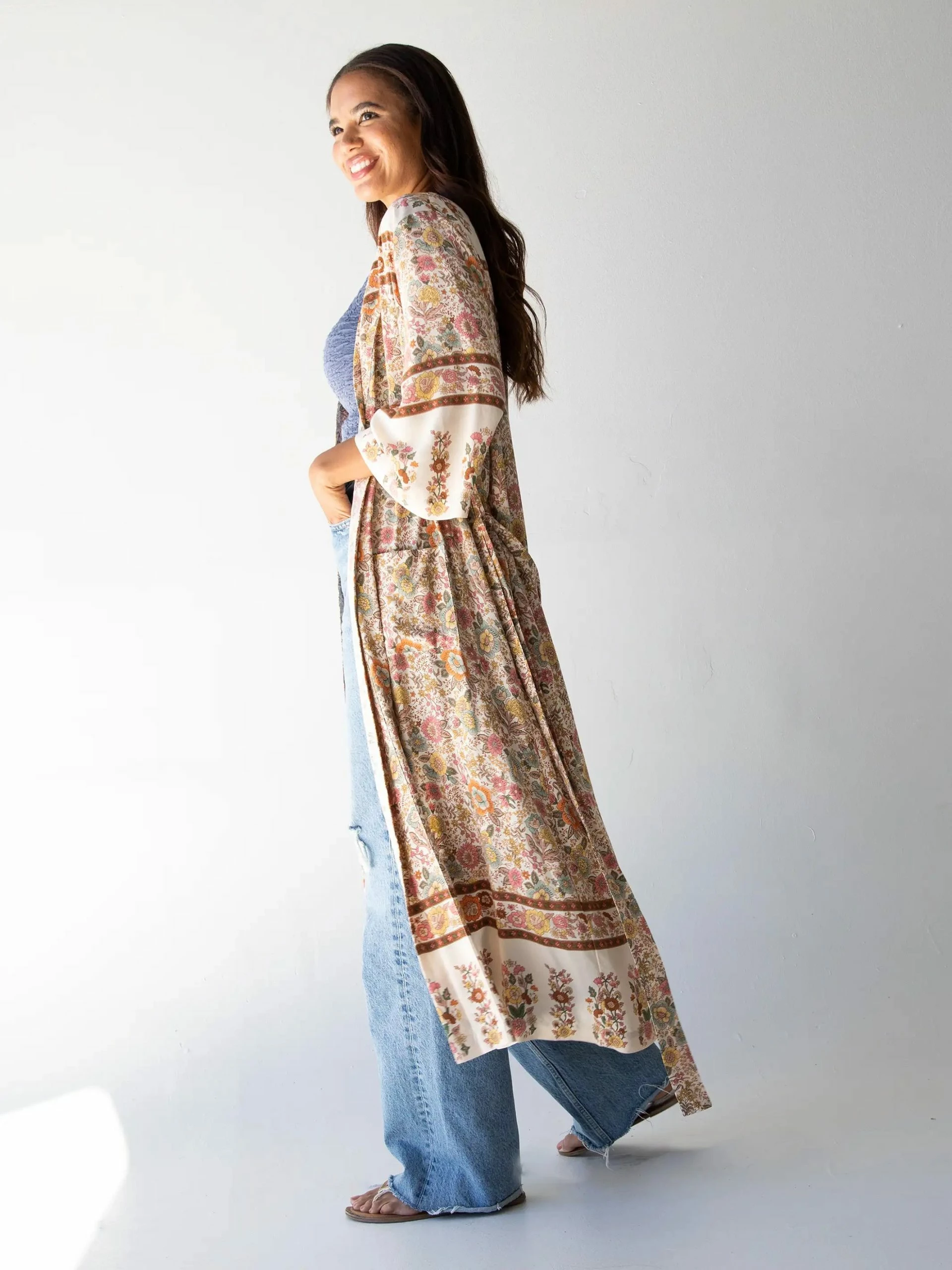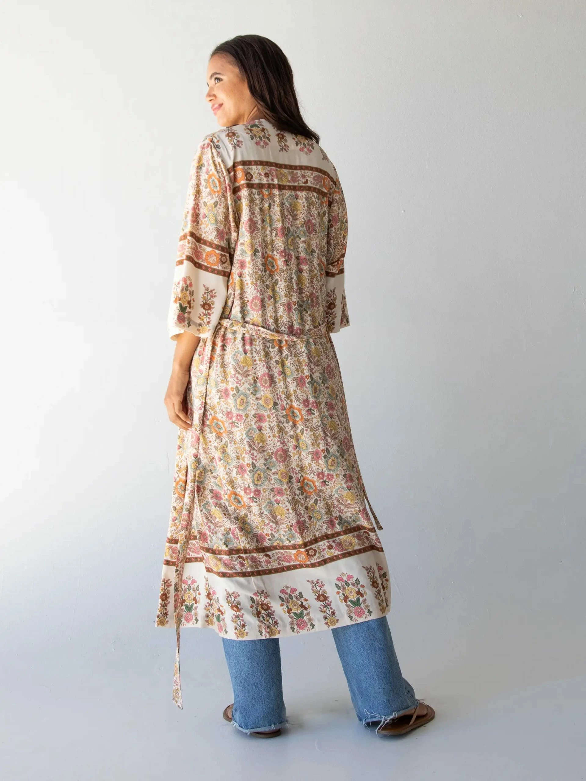 The Let’s Go West Kaftan is one of our favorites! It features a pretty bohemian floral print, a belt and patch pockets in the front. There are inside ties for when you want to wear it closed, but it also looks super cute open and styled like a kimono over jeans! We also love wearing it as a bathing suit cover-up, it’s the kind of piece that makes you feel like you’re on vacation!
