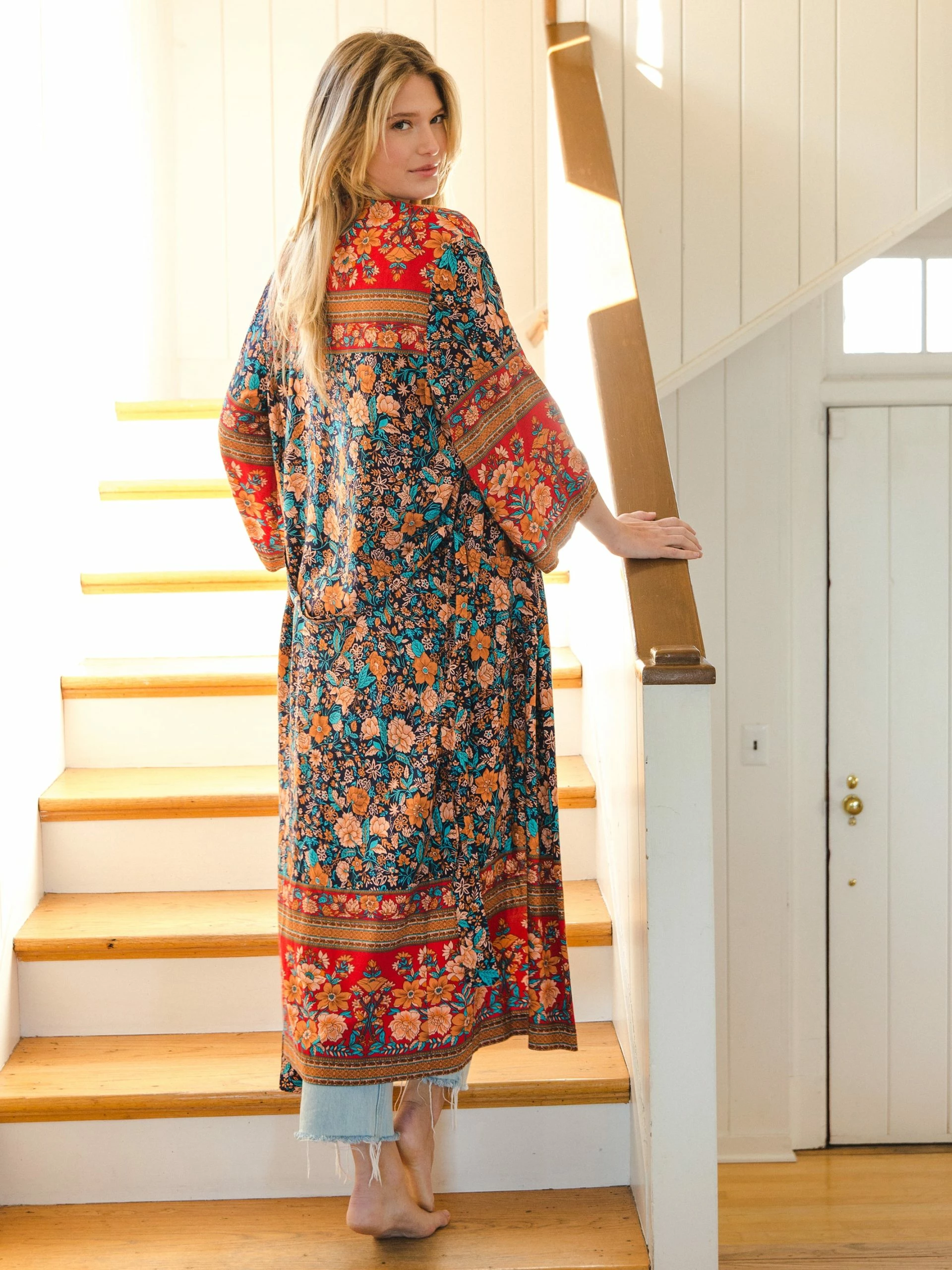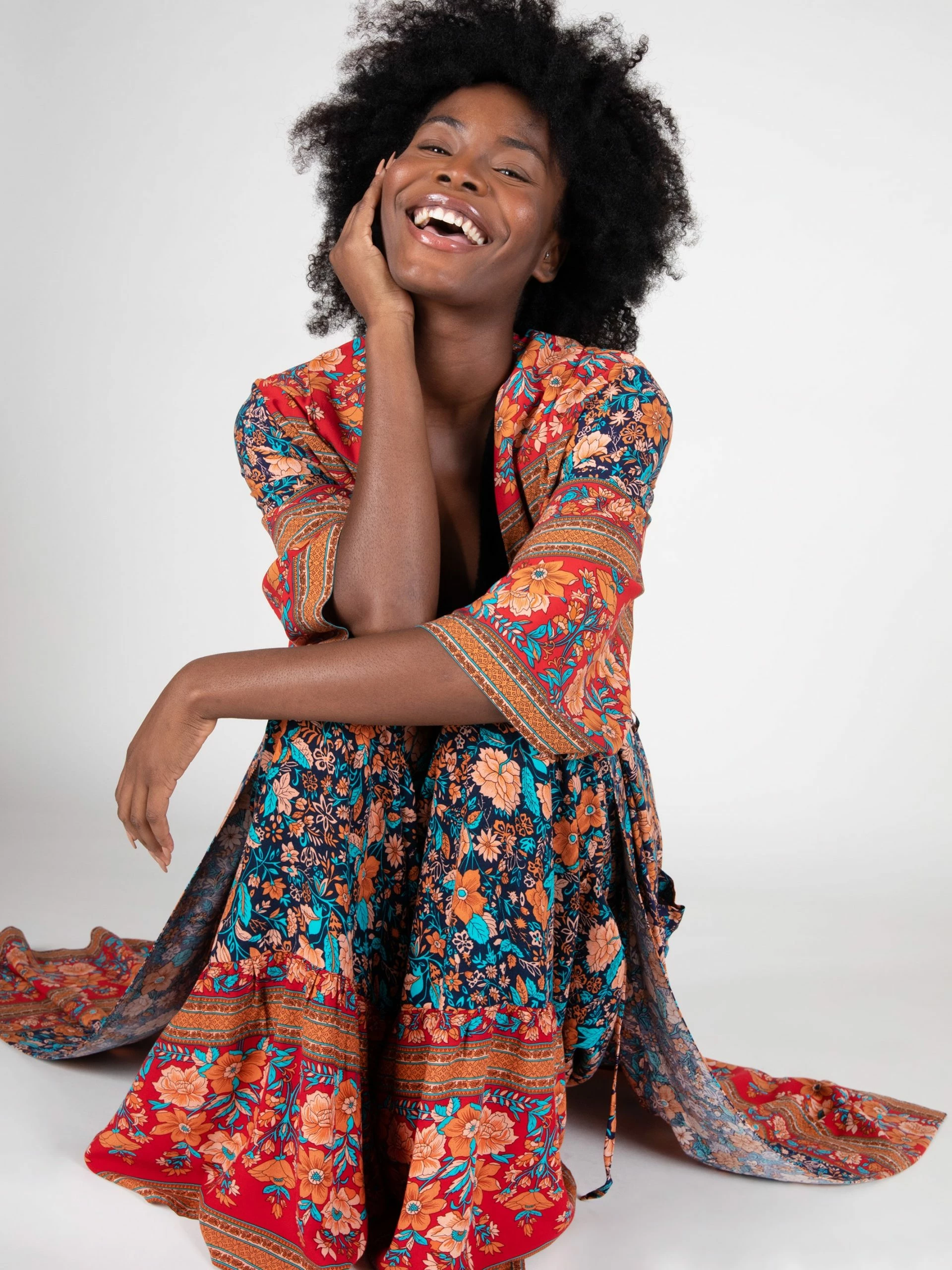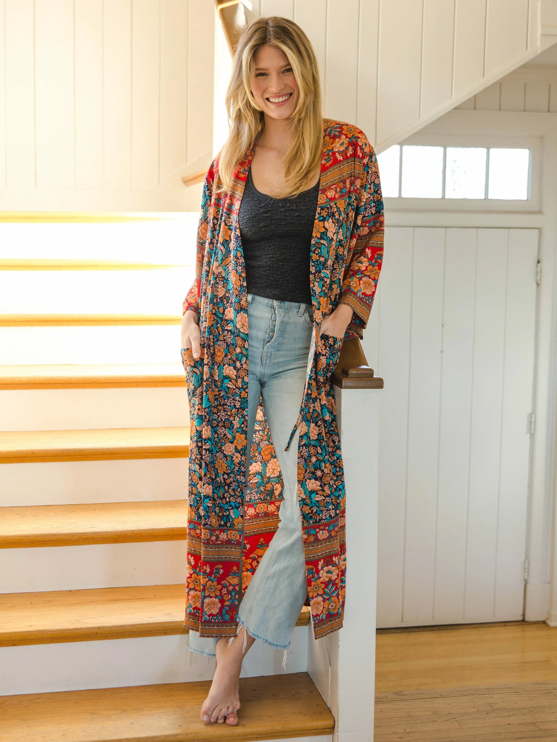 The Let’s Go West Kaftan is one of our favorites! It features a pretty bohemian floral print, a belt and patch pockets in the front. There are inside ties for when you want to wear it closed, but it also looks super cute open and styled like a kimono over jeans! We also love wearing it as a bathing suit cover-up, it’s the kind of piece that makes you feel like you’re on vacation!