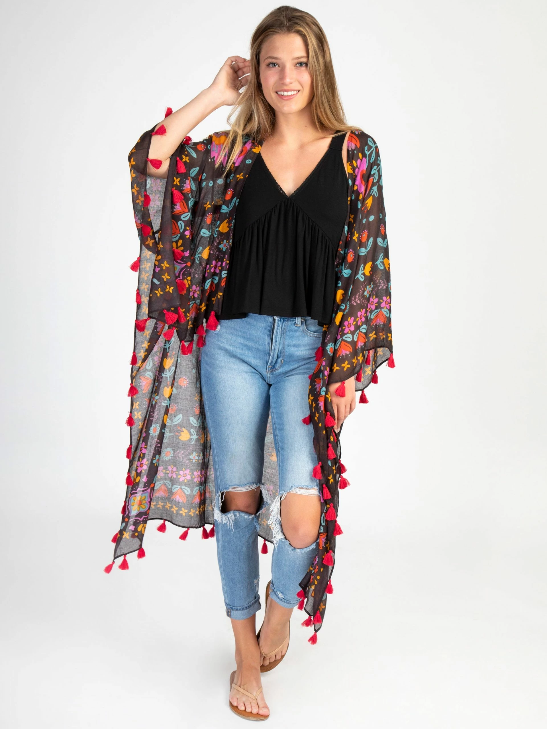 We love this breezy kimono! It features a vintage inspired print, making it a one-of-a-kind piece. It is so lightweight and easy to wear and looks so cute worn over your favorite cami, dress or bathing suit!