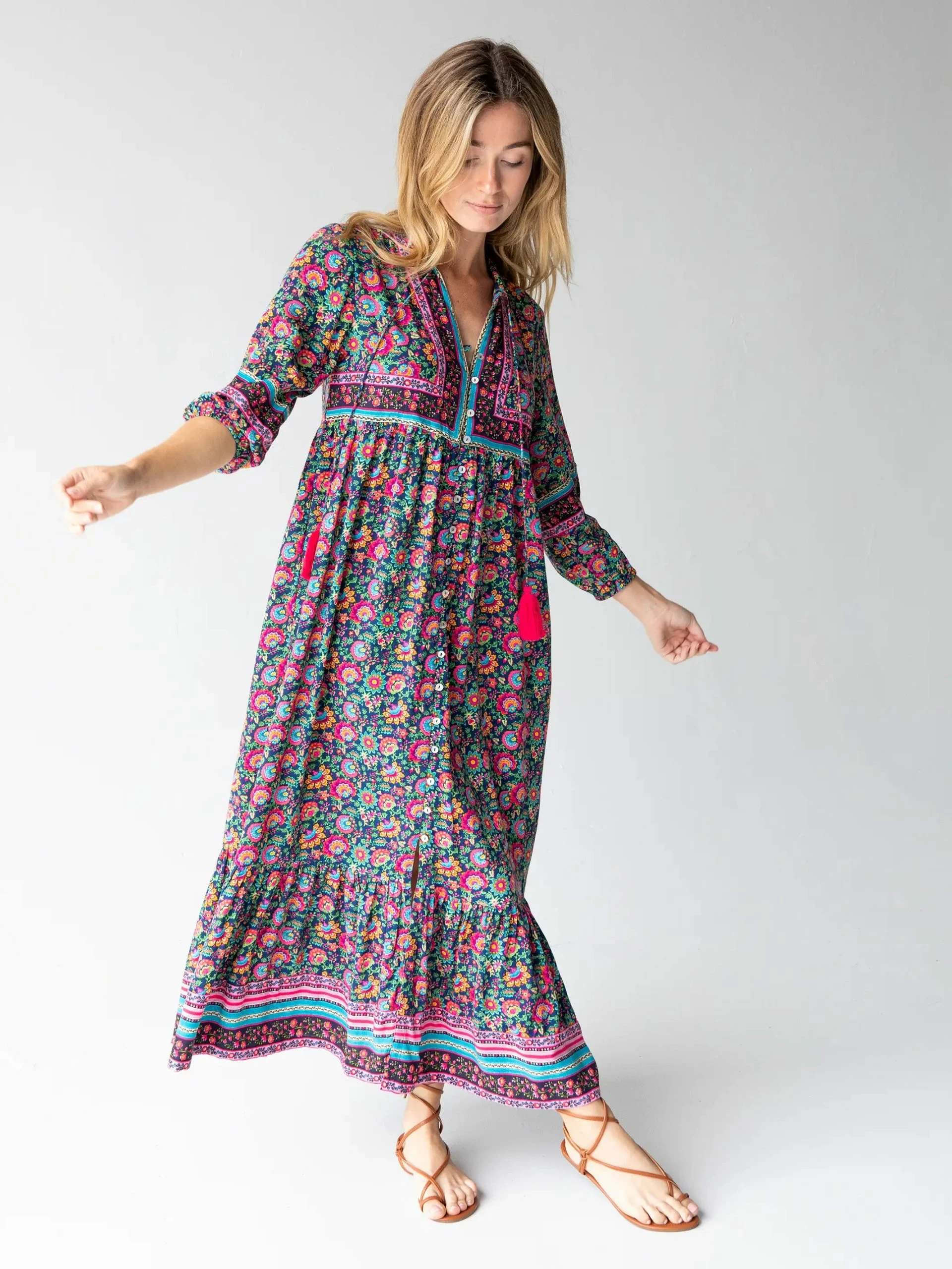 When you don’t know what to wear, throw on the Phoebe Maxi Dress and you’re literally dressed in seconds and ready for anywhere! This maxi dress has full, three-quarter length sleeves and boho tassels. Buttons line all the way down this dress from the empire waist to your ankles. The matching borders at the hem and bodice give it a bit more boho!