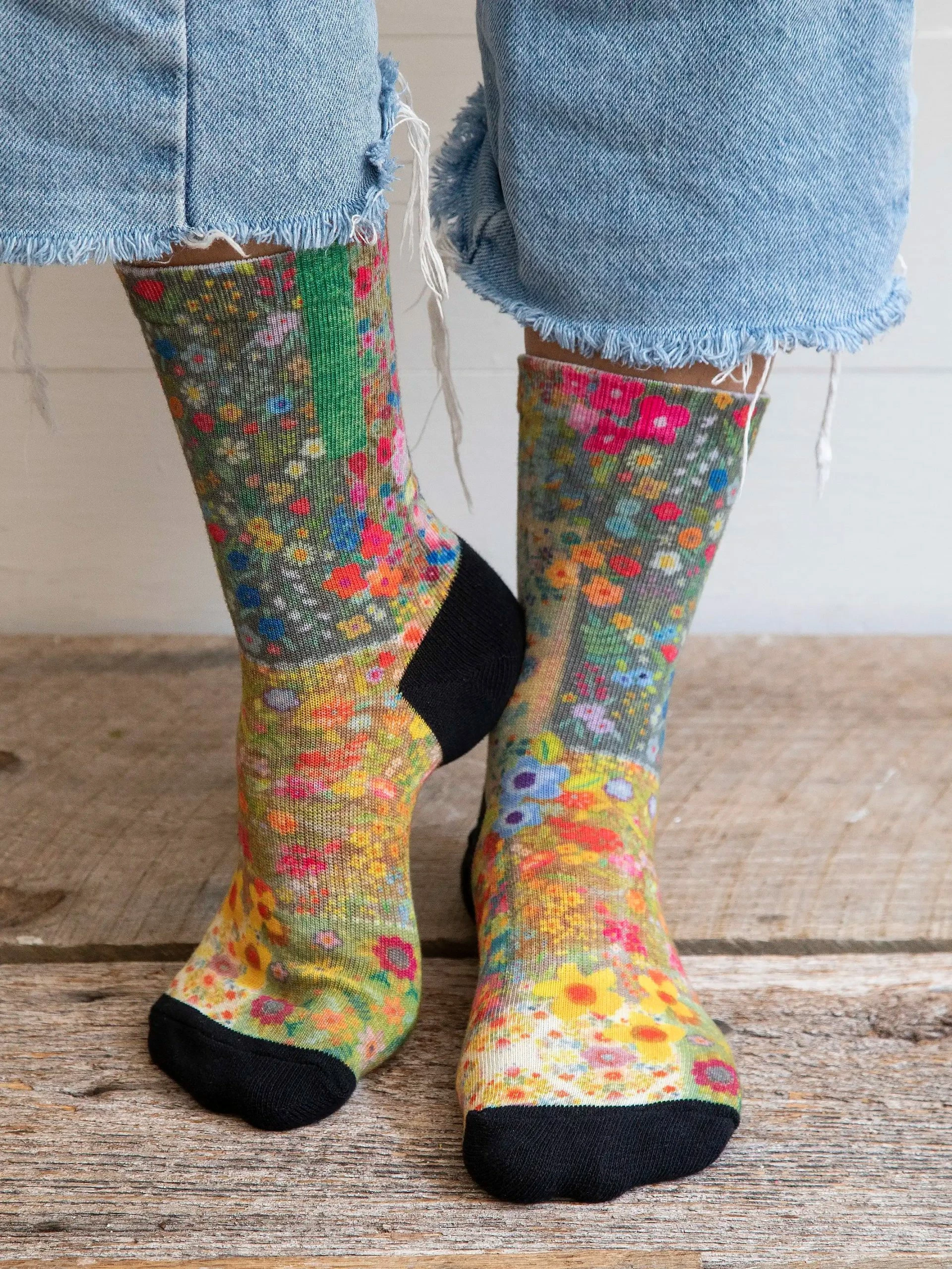 These Weekend Socks are so cute, you won’t save them for the weekend! Treat yourself to wearing these crew-length socks on any average Thursday too! Bright and bohemian, they’ll bring a smile when you see them peeking out from under your Birks, boots, or sneakers. Not only do they spark JOY, but they’re also soft and comfy. Don’t your hard-working feet deserve to be happy too? Send them to a friend who could use a little comfy color in their life. We’re thinking you’ll need a pair for Monday, Tuesday, Wednesday…