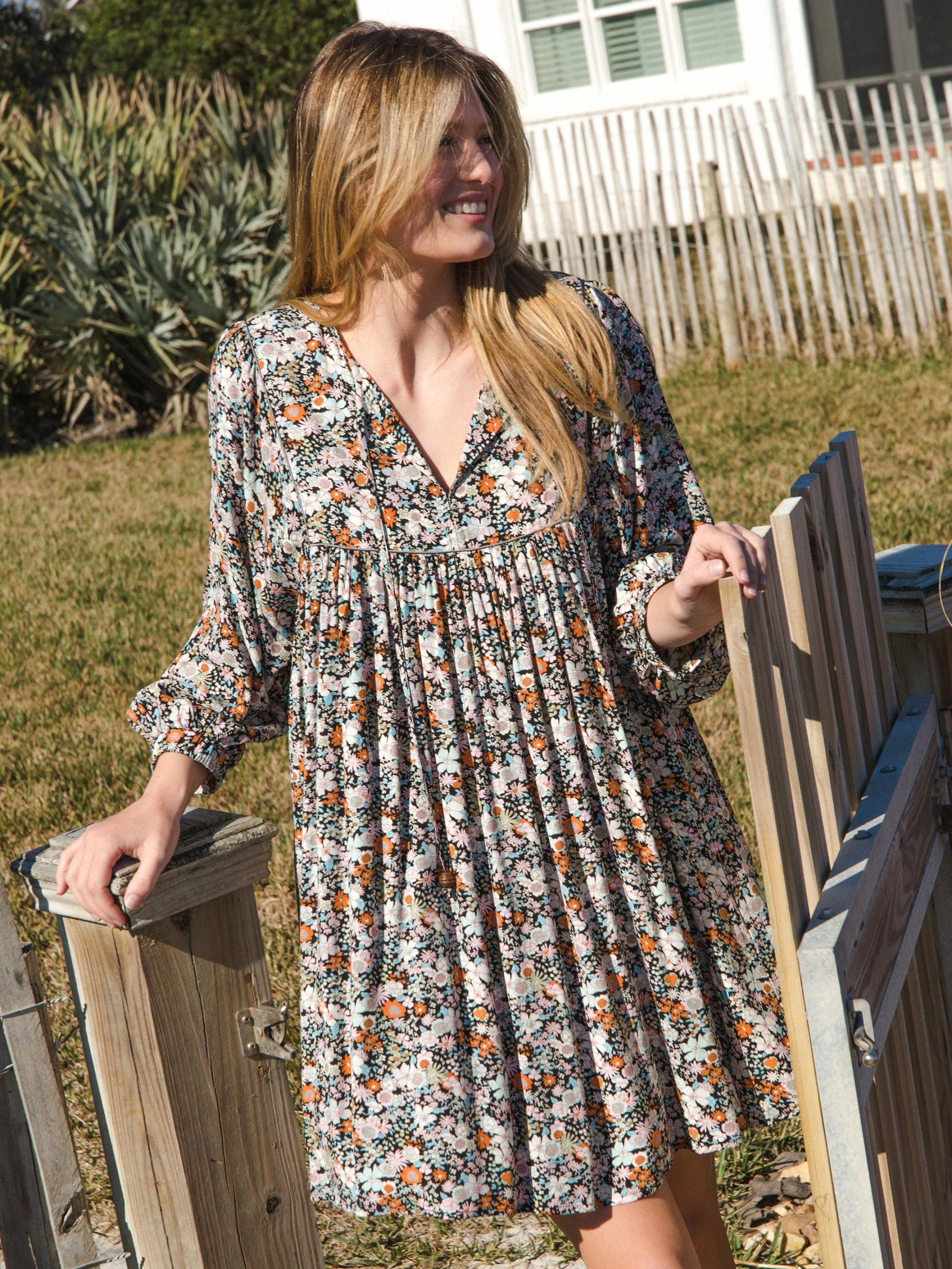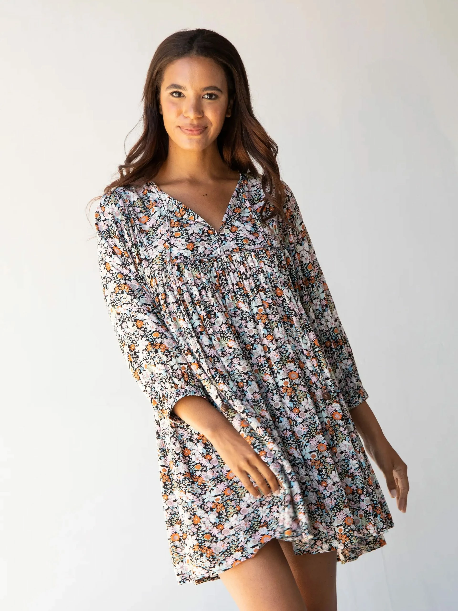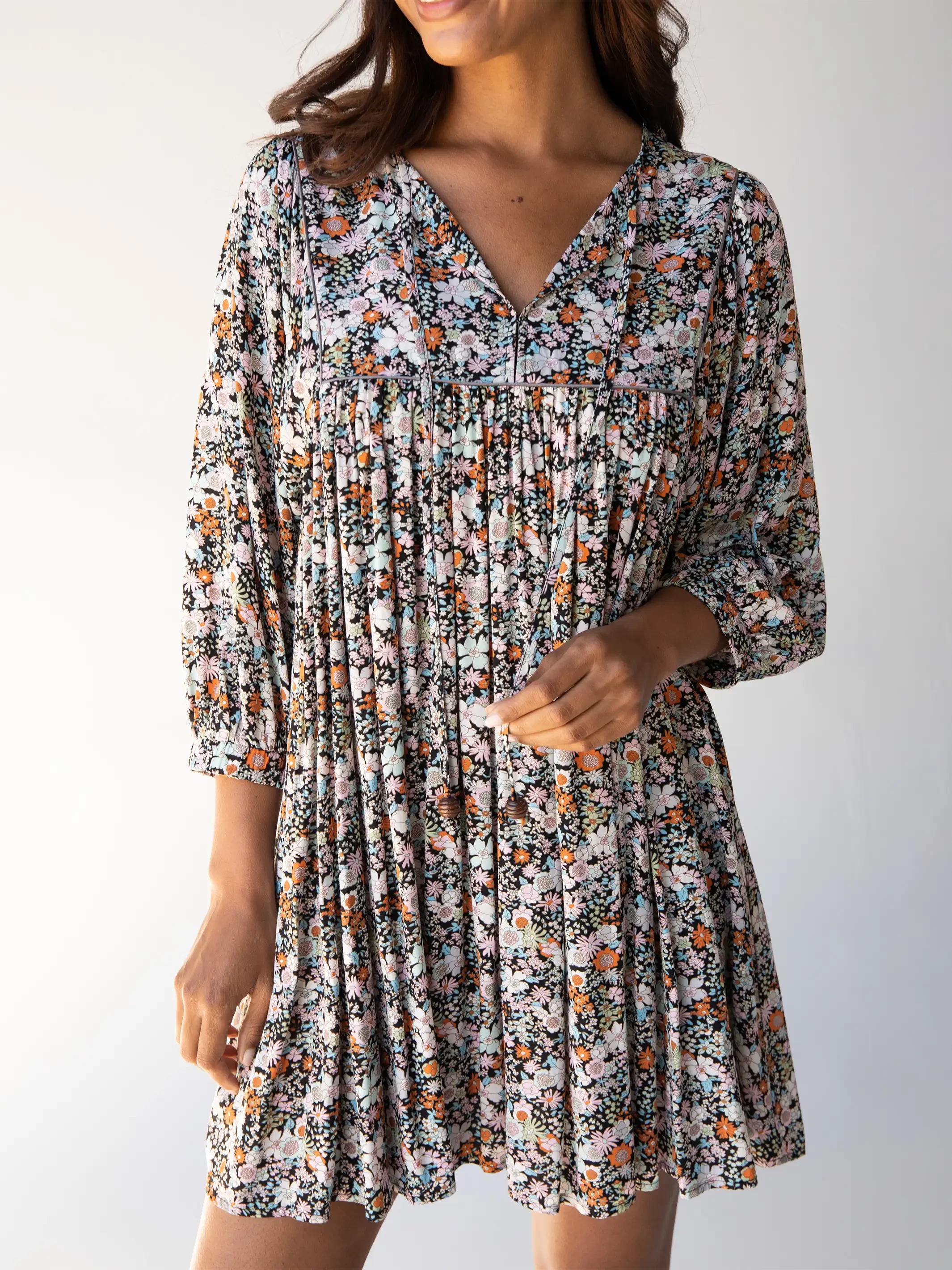 The Rose Dress is that happy little mini dress that’s so fun and feminine to wear! The pleated full skirt is an adorably short length and a full trapeze style that swings when you walk. Statement sleeves always add such style, like these poetically puffed three-quarter length sleeves! The ties with wooden beads on the split-front neckline give it such an eclectic vibe. Did you notice the piping at the top? Details matter! You’ll love wearing it in the spring and summer sun, but this floral mini dress just as easily adapts to fall and winter too. Wear it over jeans like a peasant tunic top! What about leggings and boots? The Rose Dress is that unique bohemian piece you can dress up or down to add so much variety to your wardrobe!