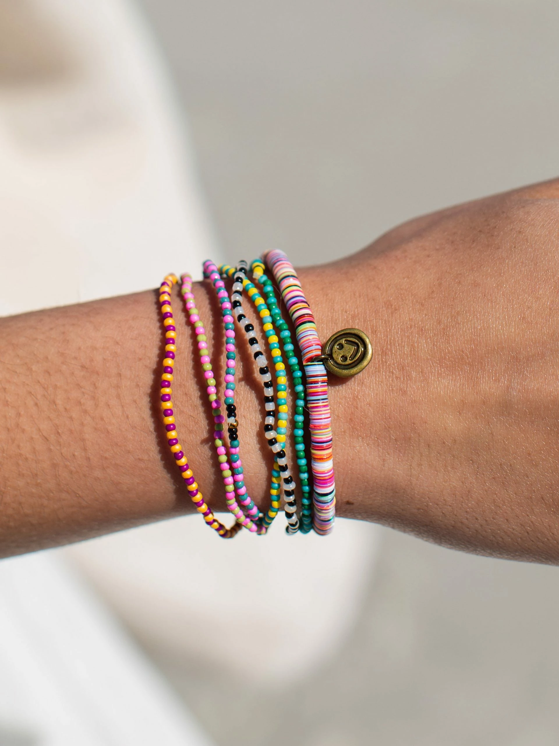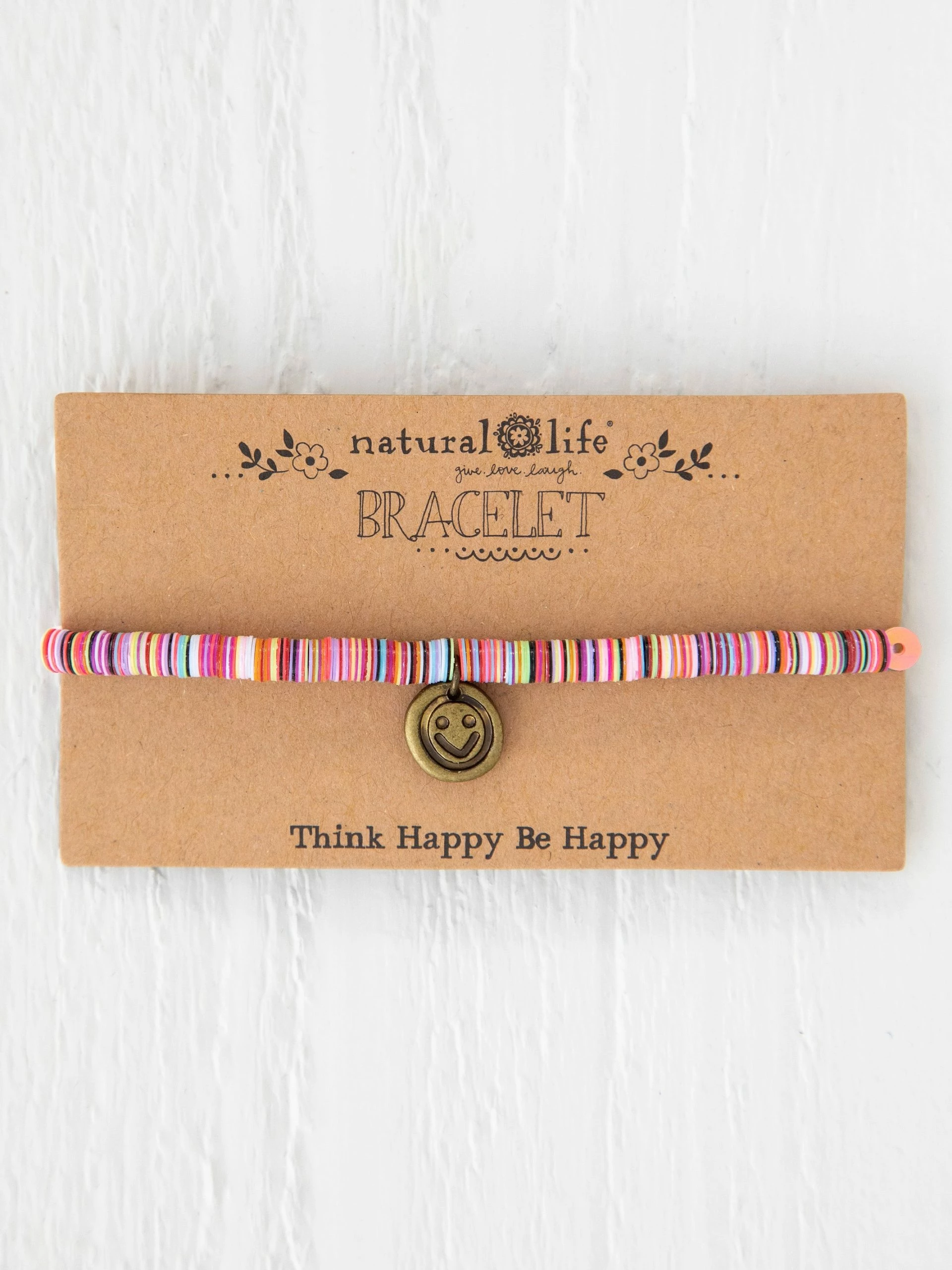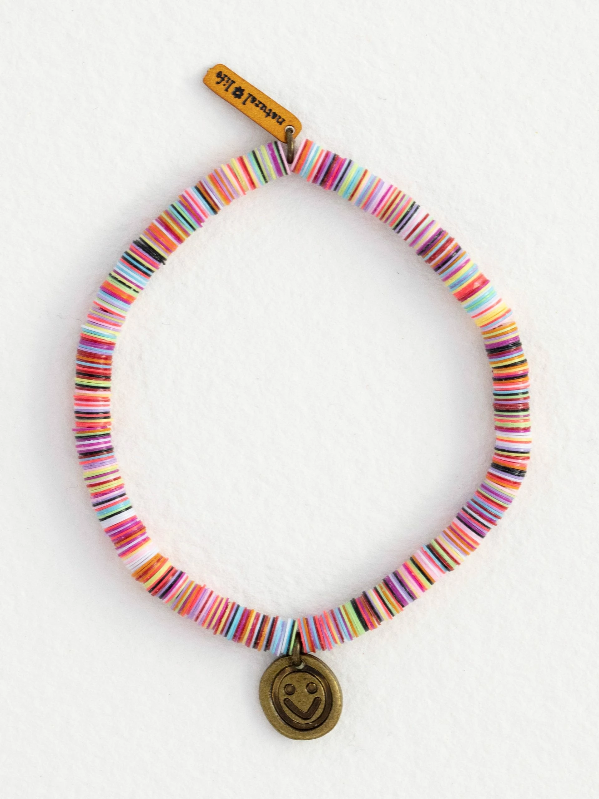 You can never have too many cute bracelets! This beaded bracelet is made with colorful sequins and features a smiley face charm, reminding you to live HAPPY! It looks great worn alone or stacked with other bracelets for a fun look!