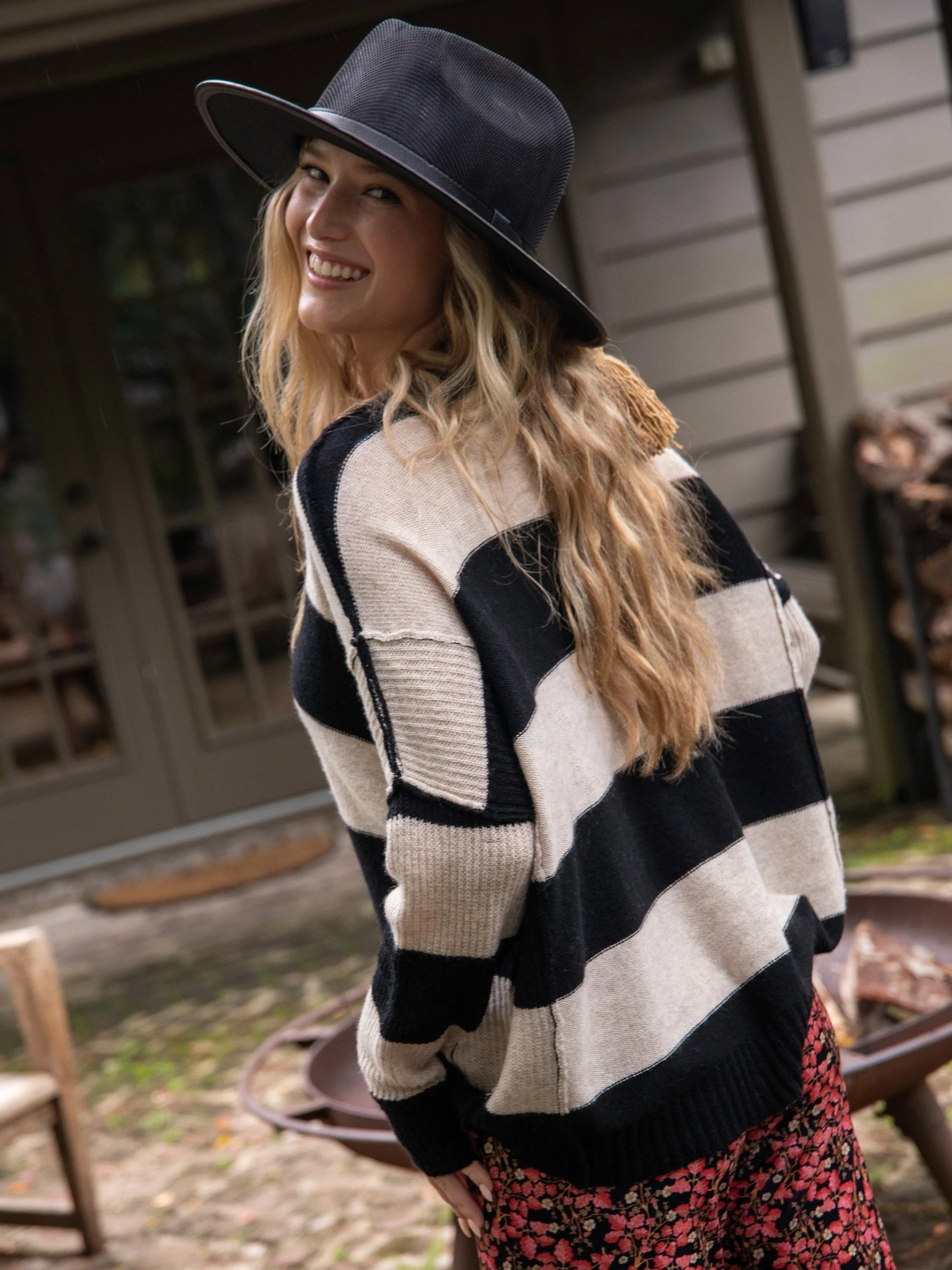 Everyone needs at least one Slouchy V-neck Sweater in their wardrobe. While it’s super soft, striped, and slouchy, it’s also super comfy and easy to throw on with anything like leggings, jeans, or a maxi skirt! Add a tee underneath, a Boho Bandeau, or even our Strappy Bralette! We love the fun casual inside-out construction with seams on the OUTside! There’s even a little pattern of hole details woven along the hem for a fun look. It’s a must for cold winter walks, ski trips, or just when you’re having a movie night. Fun, slouchy sweaters make great gifts and are easy to fit anyone! We’ve designed it for oversized, slouchy comfort, so size down for a less slouchy fit.