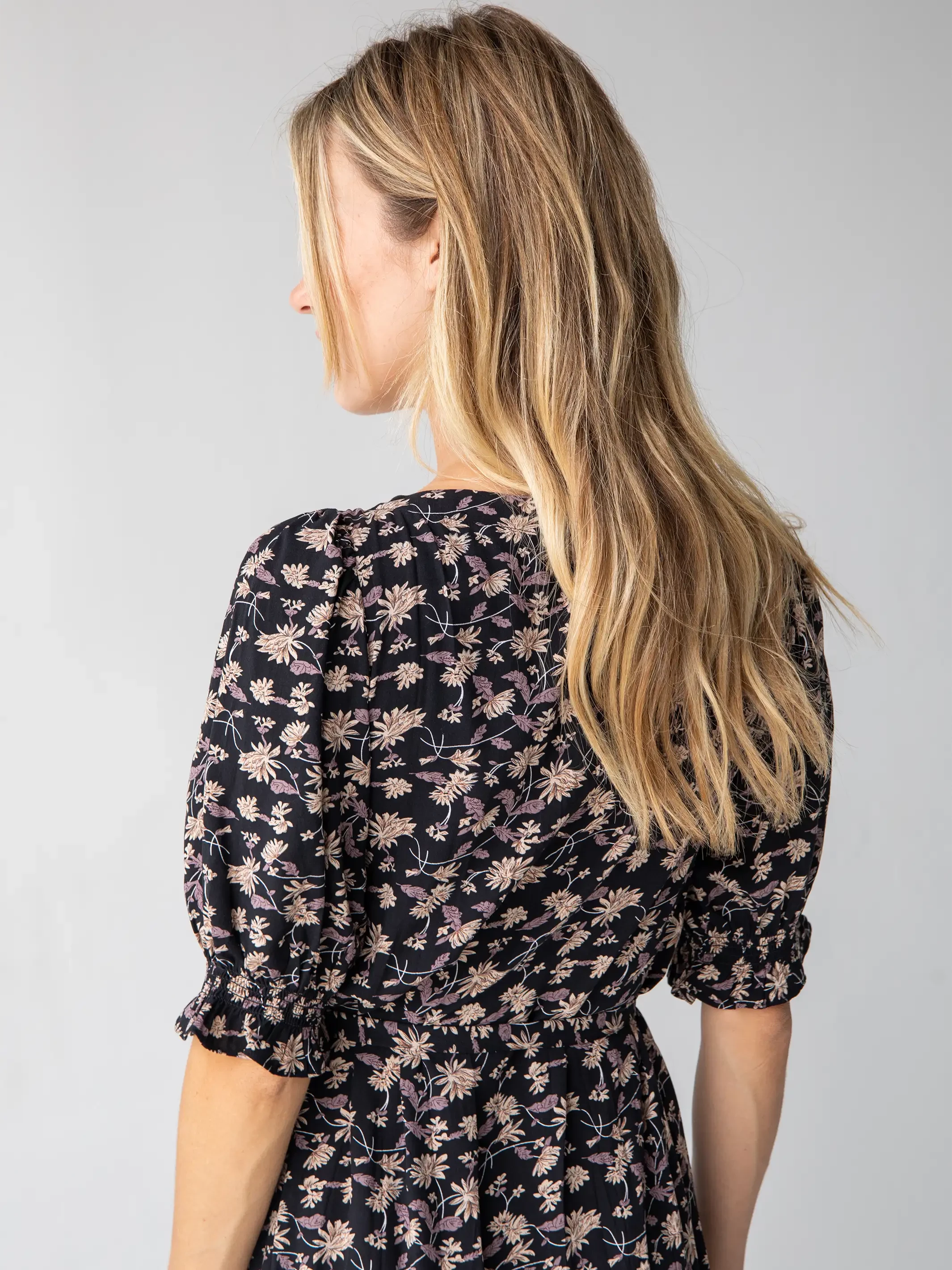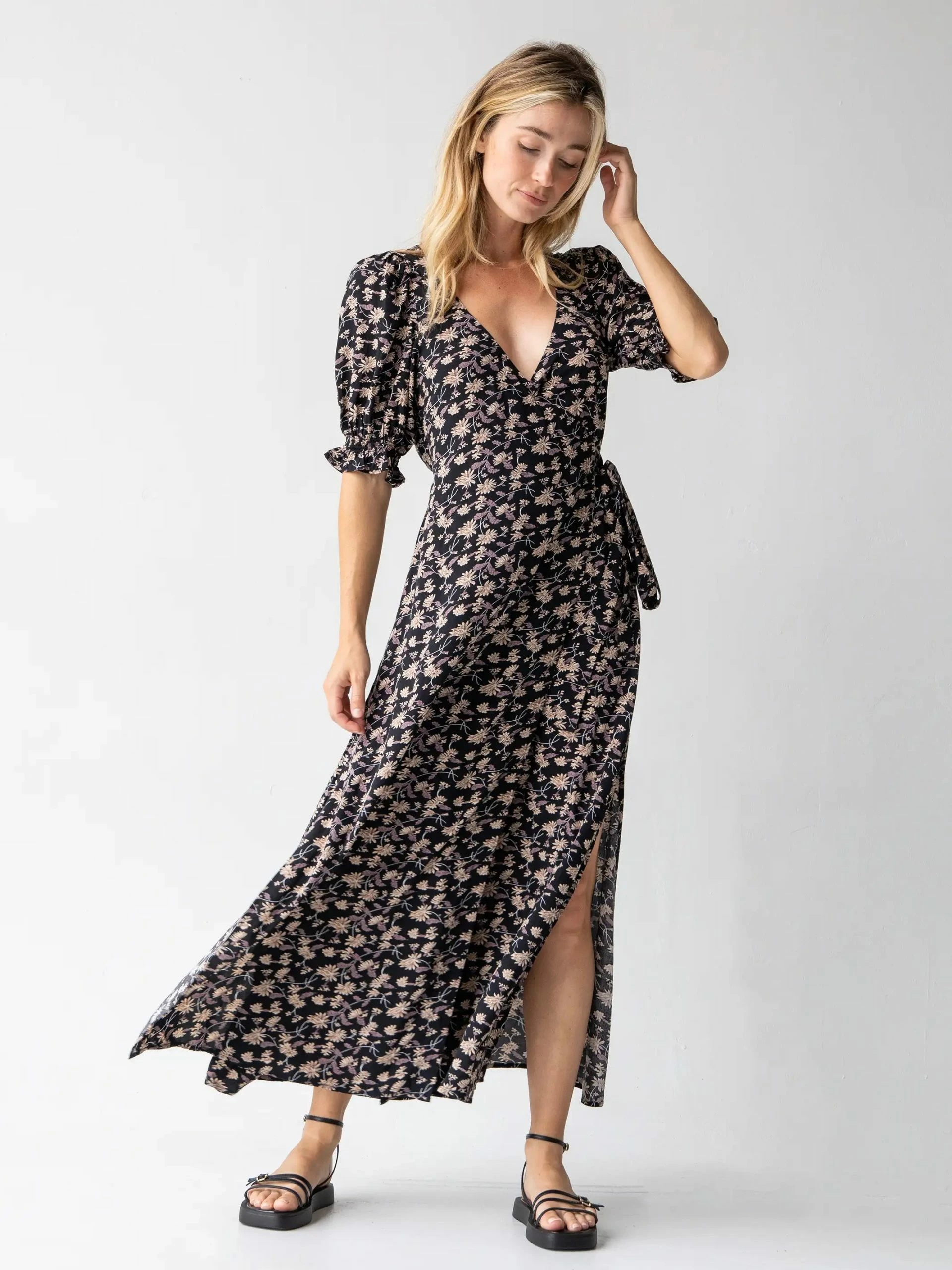 The Sophia Wrap Midi Dress is a classic shape in a pretty print! A dress you can wear to work or dinner. Side seam openings allow you to wrap the flowy sash for a flattering custom wrapped fit that’s just right for you! It features a low v-neckline, but no worries – a top snap is included to use if needed! This short sleeve dress has double side slits to make walking (or dancing) easy! Compliments will follow!